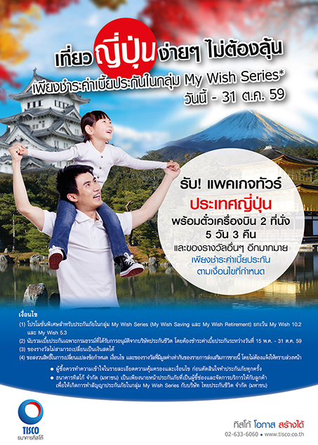 ธ.ทิสโก้ มอบแพคเกจทัวร์ประเทศญี่ปุ่น 5 วัน 3 คืน พร้อมตั๋วเครื่องบิน 2 ที่นั่ง และของรางวัลอื่นๆ อีกมากมาย เพียงชำระค่าเบี้ยประกันในกลุ่ม My Wish Series ตามเงื่อนไขที่กำหนด