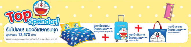 Top Spender รับกระเป๋าสะพายโดราเอมอน และกระเป๋าเดินทางโดราเอมอน และชุดเครื่องนอนโดเรมอน มูลค่ารวม 13,570 บาท เมื่อใช้จ่ายสะสมสูงสุด 100,000 บาทขึ้นไป ตลอดรายการ