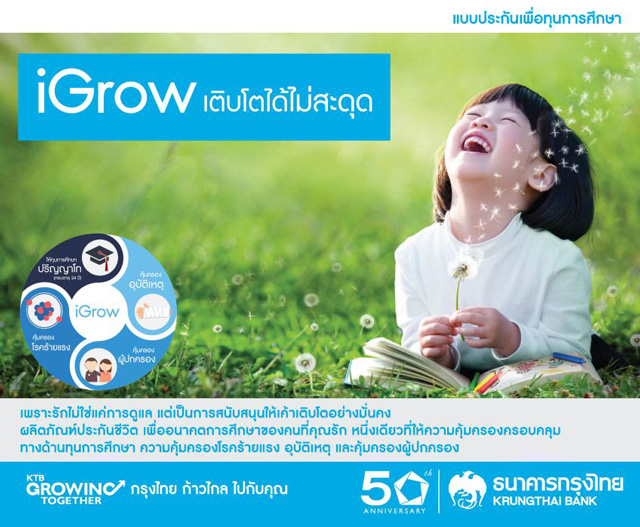iGrow ผลิตภัณฑ์ประกันชีวิต เพื่ออนาคตการศึกษาของคนที่คุณรัก จาก กรุงไทย-แอกซ่า หนึ่งเดียวที่ให้ความคุ้มครองอุบัติเหตุ (เฉพาะสำหรับเด็ก) โรคร้ายแรงในเด็ก ค่าชดเชยรายวัน แถมคุ้มครองกรมธรรม์หากเกิดเหตุไม่คาดคิดกับ "ผู้ปกครอง" และให้เงินก้อนเมื่อครบอายุ 24 ปีเพื่อสนับสนุนการศึกษาของลูกในระดับปริญญาโท