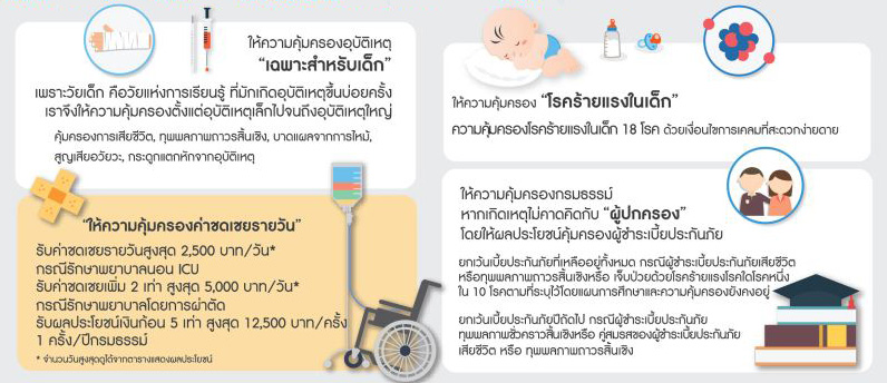 - ให้ความคุ้มครอง โรคร้ายแรง ในเด็ก 18 โรค และค่าชดเชยรายวัน สำหรับเด็กกรณีเข้ารักษาตัวในโรงพยาบาล