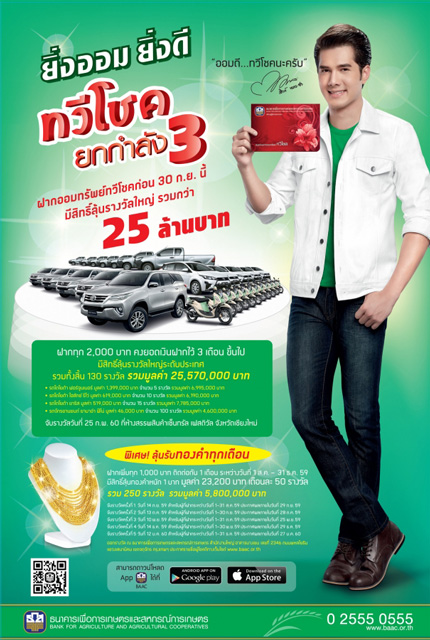 ยิ่งออม ยิ่งดี ทวีโชคยกกำลัง 3 ฝากออมทรัพย์ทวีโชค กับ ธ.ก.ส. วันนี้ มีสิทธิ์ลุ้นรางวัลใหญ่ รวมกว่า 25 ล้านบาท