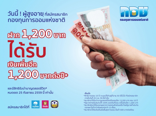พิเศษ! สำหรับผู้สูงอายุที่สมัครสมาชิกกองทุนการออมแห่งชาติ (กอช.) วันนี้ พร้อมฝาก 1,200 บาท ได้รับเพิ่มอีก 1,200 บาทต่อปี และมีสิทธิรับบำนาญตลอดชีวิต