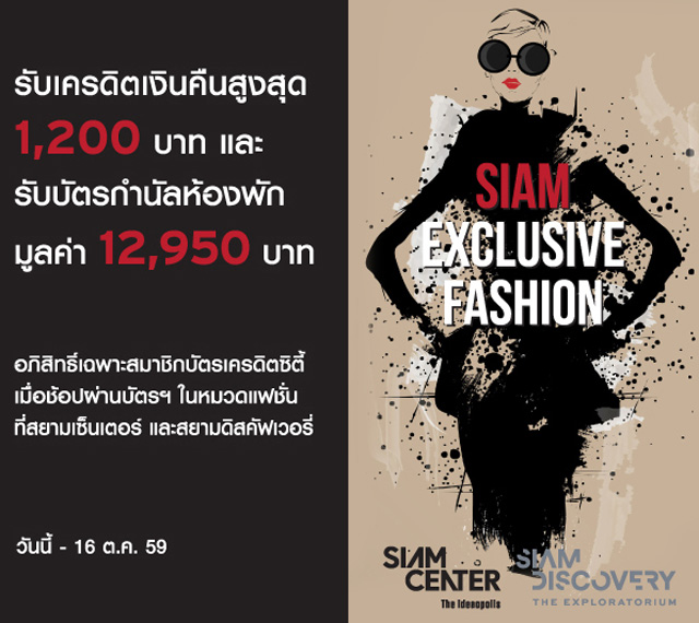 รับเครดิตเงินคืนสูงสุด 1,200 บาท และรับบัตรกำนัลห้องพักมูลค่า 12,950 บาท เมื่อช้อปในหมวดแฟชั่น ที่สยามเซ็นเตอร์ และสยามดิสคัฟเวอรี่ ผ่าน