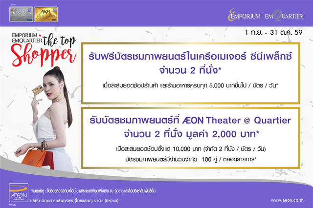 - สะสมยอดการใช้จ่ายผ่านบัตรเครดิตอิออนครบทุก 10,000 บาท แลกรับบัตรชมภาพยนต์ Aeon Theatre at Quartier จำนวน 1 คู่ ประกอบด้วยบัตรชมภาพยนตร์ 2 ที่นั่ง และ welcome set 2 ชุด (จำกัด 1 คู่/ บัตร/ วัน และจำกัดจำนวน 100 คู่/ ตลอดรายการ)