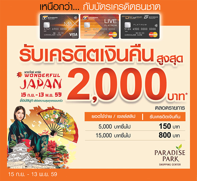 รับเครดิตเงินคืนสูงสุด 2,000 บาท เมื่อช้อปที่ศูนย์การค้า Paradise Park ผ่านบัตรเครดิตธนชาต
