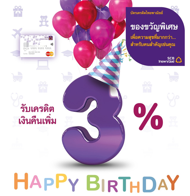 รับเงินคืนเพิ่ม 3% เมื่อมียอดใช้จ่ายในวันคล้ายวันเกิด ของขวัญสุดพิเศษ จากบัตรฯ ไทยพาณิชย์แฟมิลี่ พลัส
