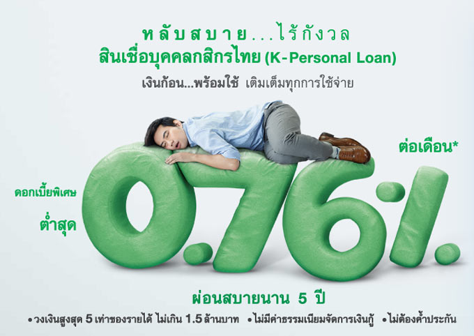 กสิกรไทยเจาะกลุ่มมนุษย์เงินเดือน ปล่อยกู้สินเชื่อบุคคลดอกเบี้ยต่ำสุด 0.76% ต่อเดือน วงเงิน 1.5 ล้านบาท ผ่อนยาวถึง 5 ปี ไม่ต้องใช้หลักทรัพย์หรือคนค้ำประกัน ไม่เก็บค่าธรรมเนียมกู้สมัครภายในปีนี้รับของกำนัล "เท็ดดี้เฮ้าส์ลิมิเต็ดเอดิชั่น" พร้อมตั้งเป้าเติบโตอย่างมีสุขภาพ คาดปี 59 สินเชื่อบุคคลโตใกล้เคียงกับภาพรวมตลาด