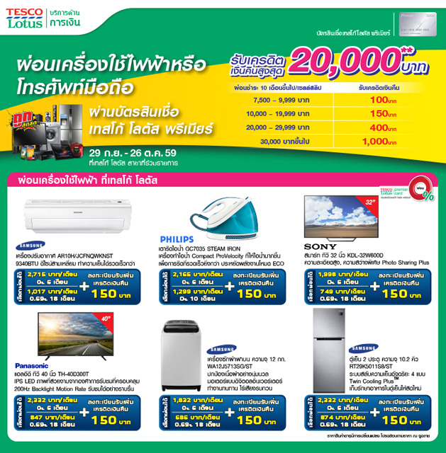 - เฉพาะการผ่อนสินค้าที่ร่วมรายการระหว่าง วันที่ 29 ก.ย. - 23 พ.ย.59 ที่เทสโก้โลตัส เท่านั้น