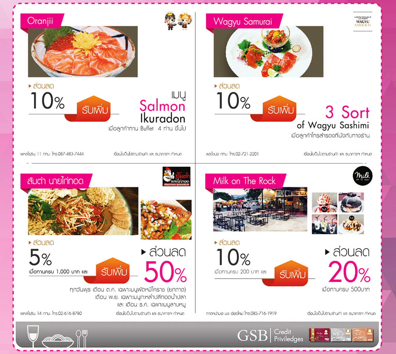 รับส่วนลดสูงสุด 10% เมื่อรับประทานอาหาร ณ ร้านค้าที่ร่วมรายการ และชำระด้วยบัตรเครดิตธนาคารออมสิน