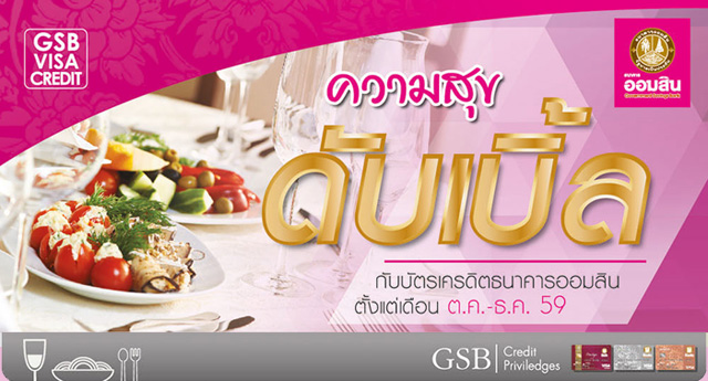 ความสุขดับเบิ้ล... กับบัตรเครดิตธนาคารออมสิน รับส่วนลดสูงสุด 10% เมื่อรับประทานอาหาร ณ ร้านค้าที่ร่วมรายการ และชำระผ่านบัตรฯ