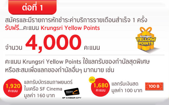 เงื่อนไขการรับคะแนน - ของรางวัลคะแนน Krungsri Yellow Points 4,000 คะแนน สำหรับลูกค้าของธนาคารประเภทบุคคลธรรมดา 1,000 ท่านแรก ที่สมัครใช้บริการหักบัญชีเงินฝากอัตโนมัติเพื่อชำระค่าบริการรายเดือน True Move-H, True Online, True Visions ระหว่างวันที่ 1 ต.ค. - 31 ธ.ค. 59 และมีรายการหักชำระค่าบริการสำเร็จ 1 ครั้ง ภายในวันที่ 28 ก.พ. 60