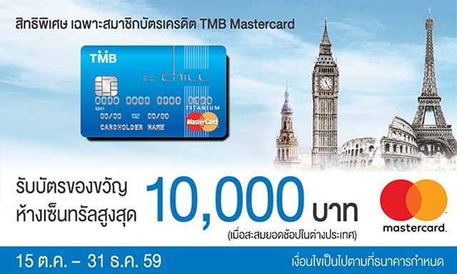 - เมื่อมียอดใช้จ่ายสะสมผ่านบัตรเครดิต TMB Mastercard ในต่างประเทศ และเลือกชำระโดยคำนวณเป็นสกุลเงินต่างประเทศ ตั้งแต่วันที่ 15 ต.ค. - 31 ธ.ค. 59 ครบ 12,000 บาทขึ้นไป รับบัตรของขวัญเซ็นทรัลมูลค่า 1,000 บาท หรือครบ 50,000 บาทขึ้นไป รับบัตรของขวัญเซ็นทรัลมูลค่า 5,000 บาท (จำกัด 2 สิทธิ์/ บัตรตลอดรายการ หรือสูงสุดมูลค่า 10,000 บาท)