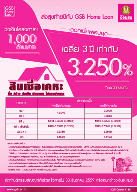 ส่งสุขท้ายปี กับ GSB Home Loan สินเชื่อเคหะ จาก ธ.ออมสิน ให้กู้เพื่อซื้อ สร้าง ต่อเติม ซ่อมแซม และไถ่ถอนจำนอง อัตราดอกเบี้ยเฉลี่ย 3 ปี ต่ำสุดเท่ากับ 3.25% ต่อปี