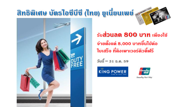 รับส่วนลด 800 บาท เมื่อใช้จ่ายที่ King Power ผ่านบัตรเครดิต ไอซีบีซี (ไทย) ยูเนี่ยนเพย์