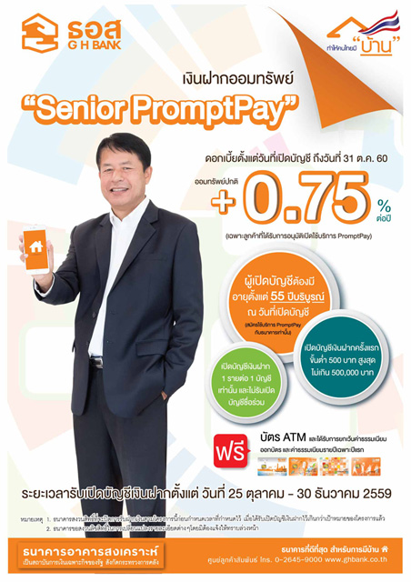 บัญชีเงินฝากออมทรัพย์ Senior PromtPay จากธนาคารอาคารสงเคราะห์ มอบดอกเบี้ยเพิ่มอีก 0.75% ต่อปี จากอัตราดอกเบี้ยเงินฝากออมทรัพย์ปกติ ฟรี! บัตร ATM พร้อมได้รับการยกเว้นค่าธรรมเนียมออกบัตร และค่าธรรมเนียมรายปีเฉพาะปีแรก สำหรับผู้มีอายุตั้งแต่ 55 ปีบริบูรณ์ขึ้นไป และสมัครใช้บริการ PromptPay กับธนาคาร