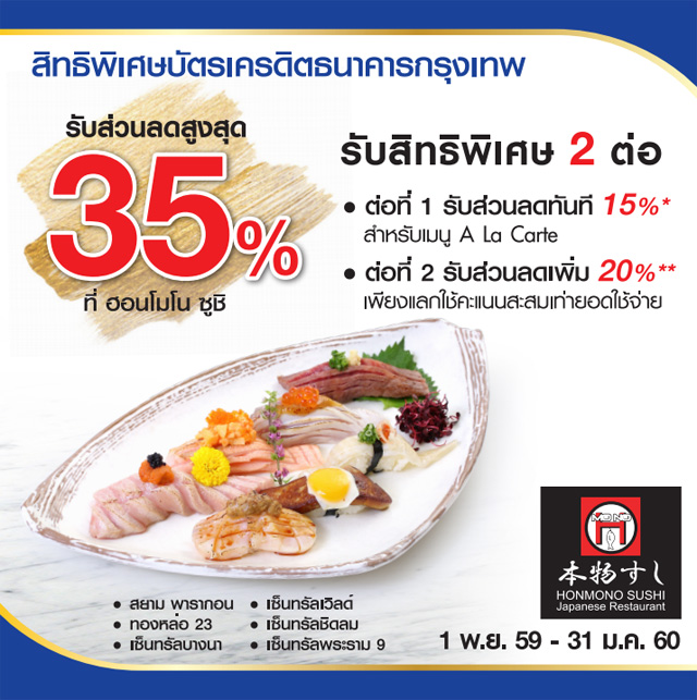 รับสิทธิพิเศษ 2 ต่อ ส่วนลดสูงสุด 35% เมื่อรับประทานที่ร้าน ฮอนโมโน ซูชิ สาขาที่ร่วมรายการ อาทิ สยาม พารากอน, เซ็นทรัลเวิลด์, ทองหล่อ 23, เซ็นทรัลชิดลม, เซ็นทรัลบางนา, เซ็นทรัลพระราม 9 และชำระผ่าน