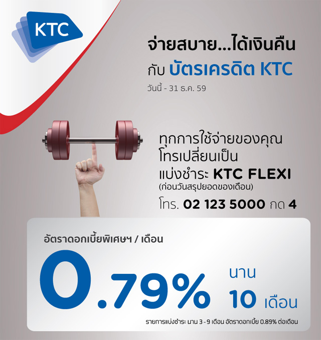 จ่ายสบาย... ได้เงินคืน กับบัตรเครดิต KTC ทุกๆ การใช้จ่ายของคุณ โทรเปลี่ยนเป็นแบ่งชำระ KTC Flexi (ก่อนวันสรุปยอดของเดือน) ผ่อนด้วยอัตราดอกเบี้ยพิเศษ 0.79% ต่อเดือน นาน 10 เดือน (รายการแบ่งชำระนาน 3 - 9 เดือน อัตราดอกเบี้ย 0.89% ต่อเดือน)
