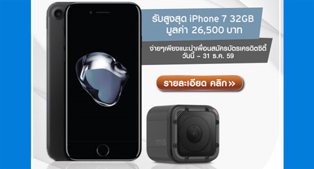 - ผู้แนะนำจะได้รับกล้อง GoPro Hero5 Session มูลค่า 10,999 บาท เมื่อสะสมครบ 5 สิทธิ์ หรือได้รับโทรศัพท์ iPhone 7 32GB มูลค่า 26,500 บาท จำนวน 1 เครื่อง เมื่อสะสมครบ 10 สิทธิ์ จากการแนะนำเพื่อนสำเร็จภายในวันที่ 1 พ.ย. - 31 ธ.ค. 2559 และในกรณีแนะนำเพื่อนสมัครบัตรฯ ผู้สมัครบัตรฯ ต้องมีการใช้จ่ายอย่างน้อย 1 ครั้ง ภายใน 30 วันหลังบัตรฯ ได้รับอนุมัติ