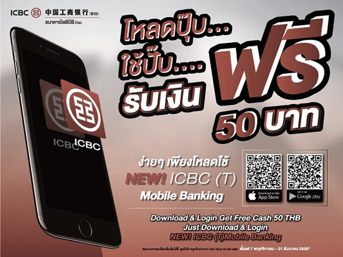 โหลดปุ๊บ... ใช้ปั๊บ... รับเงิน ฟรี! 50 บาท ง่ายๆ เพียงโหลดใช้ NEW! ICBC (T) Mobile Banking จาก ธ.ไอซีบีซี ไทย ตั้งแต่วันที่ 7 พฤศจิกายน - 31 ธันวาคม 2559