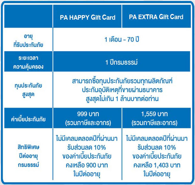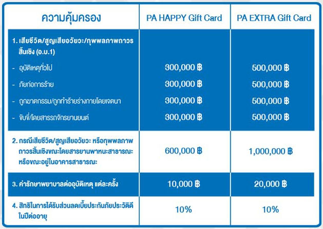 - สิทธิพิเศษที่ลูกค้าได้รับ มอบ Accident Care Card ซึ่งช่วยอำนวยความสะดวกในการเข้ารักษาการบาดเจ็บ อันเนื่องมาจากอุบัติเหตุในโรงพยาบาลในเครือข่ายมากกว่า 300 แห่งโดยที่ไม่ต้องสำรองจ่าย (ยกเว้นส่วนที่เกินจากวงเงินคุ้มครองจะต้องจ่ายเอง)