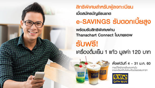 รับฟรี! เครื่องดื่มเย็น 1 แก้ว เมื่อสมัครบัญชีธนชาต e-SAVINGS