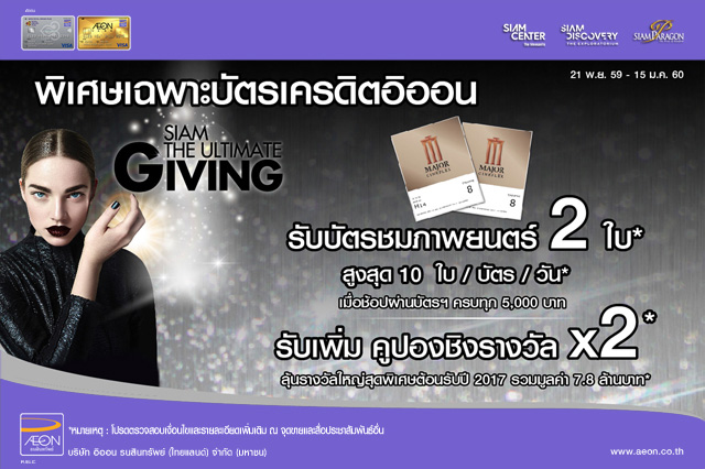 - บริษัทฯ ขอสงวนสิทธิ์การเข้าร่วมรายการส่งเสริมการขาย เฉพาะสมาชิกที่มีการใช้จ่ายผ่านบัตรเครดิตอิออน ณ ร้านค้าเช่า ภายในศูนย์การค้าสยามพารากอน, สยามเซนเตอร์ และสยามดิสคัฟเวอรี่ ในระหว่างวันที่ 21 พฤศจิกายน 2559 - 15 มกราคม 2560 (56 วัน) เท่านั้น