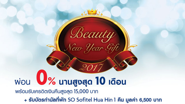 ผ่อน 0% นานสูงสุด 10 เดือน พร้อมรับเครดิตเงินคืนสูงสุด 15,000 บาท และรับบัตรกำนัลที่พัก SO Sofitel Hua Hin 1 คืน มูลค่า 6,500 บาท เมื่อใช้จ่ายกลุ่มสินค้าหมวด Beauty ณ ร้านค้าที่ร่วมรายการ ผ่าน