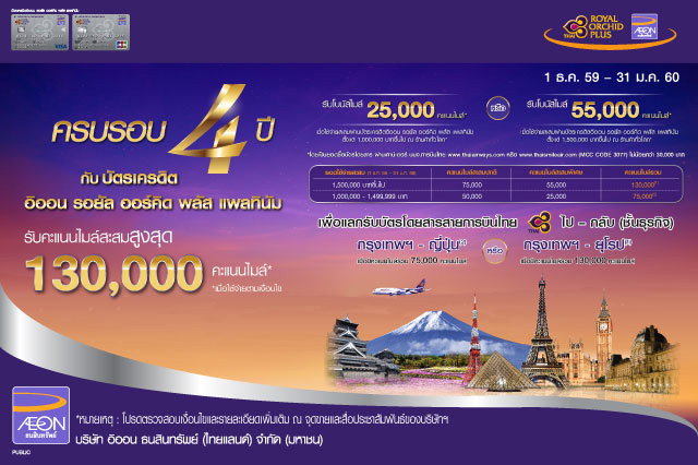 ครบรอบ 4 ปี กับ บัตรเครดิตอิออน รอยัล ออร์คิด พลัส แพลทินัม รับคะแนนไมล์สะสมสูงสุด 130,000 คะแนนไมล์ เมื่อมียอดใช้จ่ายตามที่กำหนด เพื่อแลกรับบัตรโดยสารสายการบินไทย ไป-กลับ (ชั้นธุรกิจ) กรุงเทพฯ-ญี่ปุ่น หรือ กรุงเทพฯ-ยุโรป