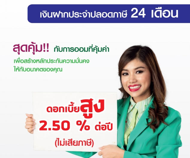 เงินฝากประจำปลอดภาษี 24 เดือน ดอกเบี้ยสูง 2.50% ไม่เสียภาษี จาก ธ.ก.ส.