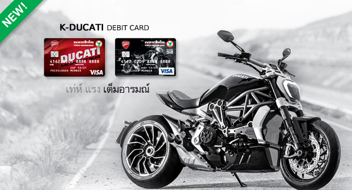 ธนาคารกสิกรไทย สิทธิประโยชน์ของบัตรเดบิตบัตร K-DUCATI DEBIT CARD - ทดลองขับฟรีที่โชว์รูมทุกสาขา