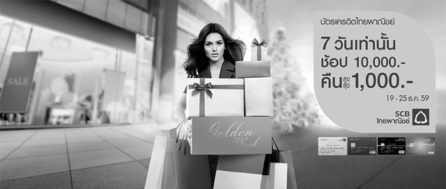 เงื่อนไขรายการส่งเสริมการขาย - สิทธิพิเศษนี้สำหรับผู้ถือบัตรที่ใช้จ่ายผ่านบัตรเครดิตไทยพาณิชย์ทุกประเภท (ยกเว้นบัตรเครดิตนิติบุคคล ไม่เข้าร่วมรายการ) ที่มียอดใช้จ่ายตั้งแต่ 10,000 บาทขึ้นไป/ เซลล์สลิป ตั้งแต่วันที่ 19 - 25 ธ.ค. 59 ที่ห้างฯ ที่ร่วมรายการ