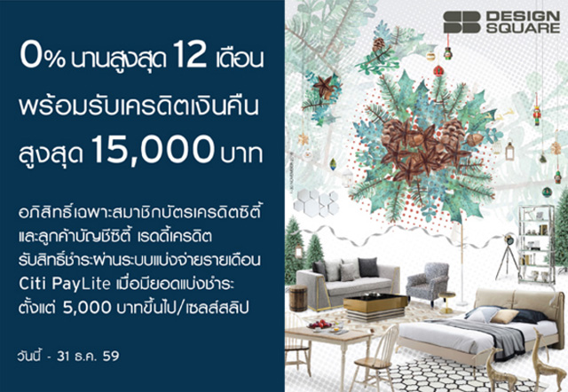 ผ่อน 0% นาน 12 เดือน พร้อมรับเงินคืนสูงสุด 15,000 บาท ที่ SB Design Square เฉพาะสมาชิกบัตรฯ ซิตี้