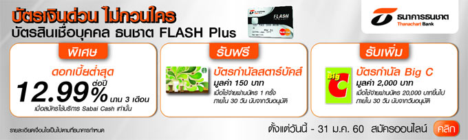 บัตรเงินด่วน ไม่กวนใคร ธนชาต FLASH Plus พิเศษดอกเบี้ย 12.99% พร้อมรับเพิ่มบัตรกำนัล