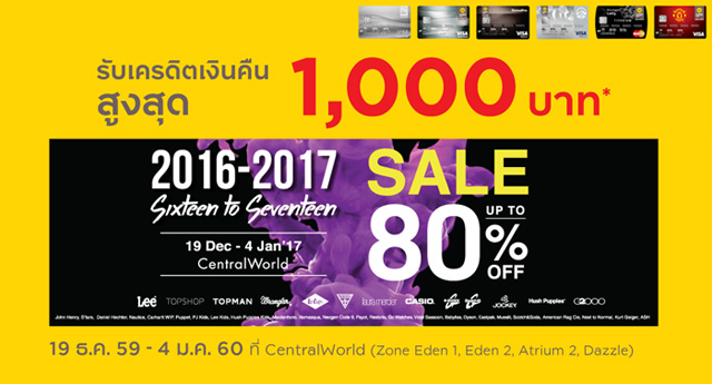 - สำหรับยอดใช้จ่ายจากเซลล์สลิปที่ใช้จ่ายภายใต้ชื่อเจ้าของบัตรและหมายเลขบัตรเครดิตเดียวกัน ที่ใช้จ่ายภายในงาน CMG Sixteen to Seventeen Sale ที่ CentralWorld (Zone Eden 1, Eden 2, Atrium 2, Dazzle) ระหว่างวันที่ 19 ธ.ค. 59 - 4 ม.ค. 60