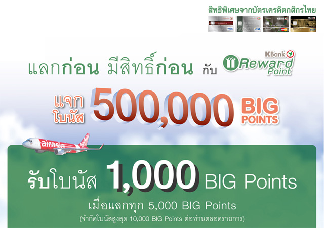 แลกก่อน มีสิทธิ์ก่อน!! สายการบินแอร์เอเชียแจกโบนัส 500,000 BIG Points โดยสมาชิกบัตรฯ จะได้รับโบนัส 1,000 BIG Points เมื่อแลกทุก 5,000 BIG Points (จำกัดโบนัสสูงสุด 10,000 BIG Points ต่อท่าน ต่อรายการ) จาก