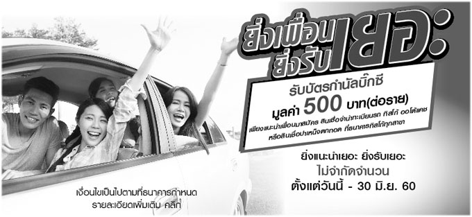 - ผู้ได้รับการแนะนำต้องยังคงสถานภาพการผ่อนชำระสินเชื่อกับทาง ธนาคาร/บริษัทฯ โดยมีการชำระค่างวดเกินกำหนด ณ วันที่สิ้นสุดแคมเปญไม่เกิน 1 งวด