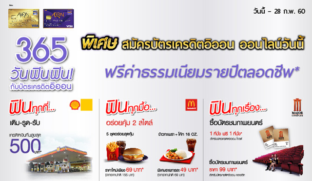 - สมัครใช้บริการบัตรเครดิตอิออนโกลด์, บัตรเครดิตอิออนคลาสสิค (วีซ่า/ มาสเตอร์การ์ด/ เจซีบี) และบัตรเครดิตร่วมพันธมิตร ผ่านช่องทางออนไลน์ ระหว่างวันที่ 1 มกราคม 2560 - 28 กุมภาพันธ์ 2560 จะได้รับยกเว้นค่าธรรมเนียมรายปีตลอดชีพ (ยกเว้น บัตรเครดิตอิออน รอยัล ออร์คิด พลัส แพลทินัม, บัตรเครดิตอิออน M GEN VISA, บัตรเครดิตอิออนคลับไทยแลนด์ และบัตรเครดิตเพื่อองค์กรทุกประเภท) - รับความสุขทุกการใช้จ่าย**
