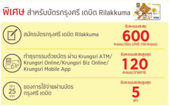 - ลูกค้าที่ผ่านการลงทะเบียนและทำการสมัครเพื่อเปิดใช้บริการบัตรเดบิต Rilakkuma รับคะแนนสะสม Krungsri Yellow Points 600 คะแนน (จากเดิม 150 คะแนน)