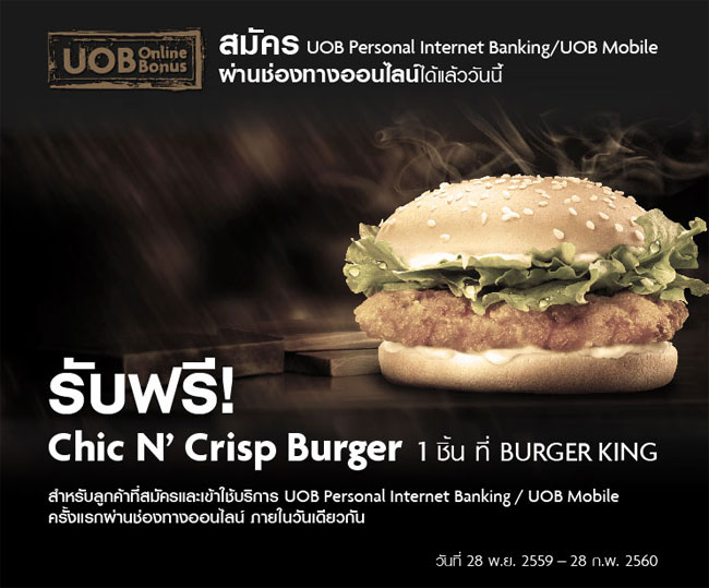 - ลูกค้าที่สมัครและเข้าใช้บริการ UOB Personal Internet Banking / UOB Mobileภายในเดือนพฤศจิกายน 2559 สามารถแลกรับ Chic N' Crisp Burger ที่ร้าน Burger King ได้ถึงวันที่ 31 ธ.ค. 59 เท่านั้น