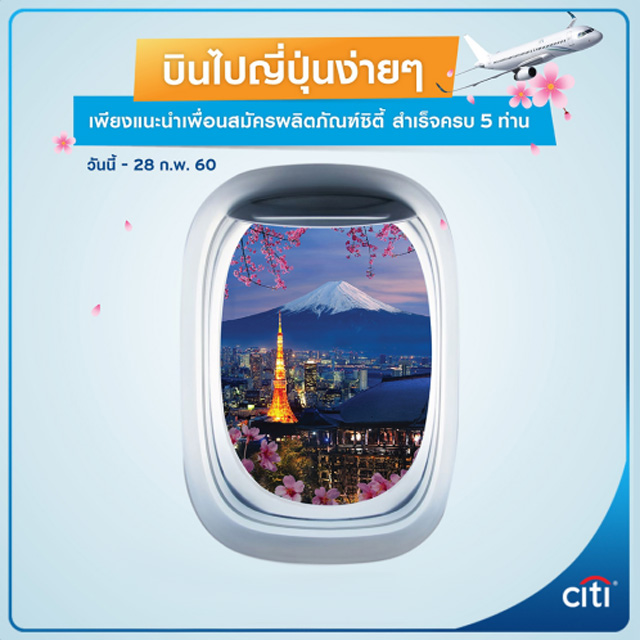 บินไปญี่ปุ่นง่ายๆ เพียงแนะนำเพื่อนสมัครบัตรเครดิตซิตี้สำเร็จ ครบ 5 สิทธิ์ วันนี้ - 28 ก.พ. 60