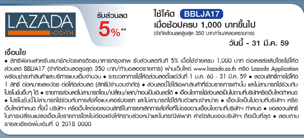 เงื่อนไขรายการส่งเสริมการขาย - สงวนสิทธิ์สำหรับสมาชิกบัตรเครดิตธนาคารกรุงเทพ เฉพาะการซื้อสินค้าออนไลน์ผ่านเว็บไซต์ที่ร่วมรายการเท่านั้น โดยมียอดใช้จ่ายผ่านบัตรเครดิตตั้งแต่ 3,500 บาทขึ้นไป และต้องลงทะเบียนทาง SMS เพื่อขอรับสิทธิ์เครดิตเงินคืน