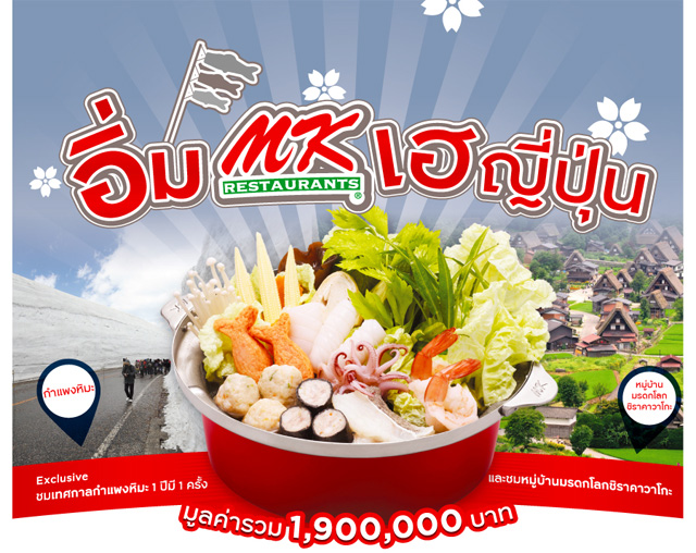 เมื่อทานครบทุกๆ 500 บาทขึ้นไป/ เซลล์สลิป รับ 1 สิทธิ์ ลุ้นชิงโชคเที่ยวญี่ปุ่น แพ็กเกจทัวร์ญี่ปุ่น 6 วัน 4 คืน 10 รางวัลๆ ละ 2 ที่นั่ง รวมมูลค่า 1,900,000 บาท (รับคูปองชิงโชคจากพนักงานหลังชำระเงิน)