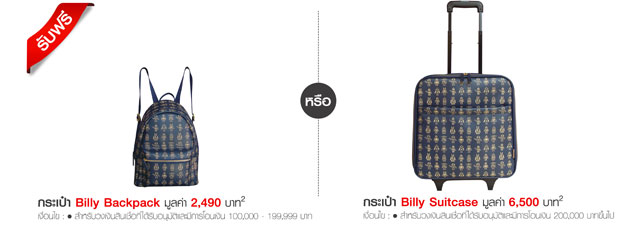 - สำหรับวงเงินสินเชื่อโอนเข้าบัญชี 200,000 บาทขึ้นไป รับกระเป๋า Billy Suitcase มูลค่า 6,500 บาท