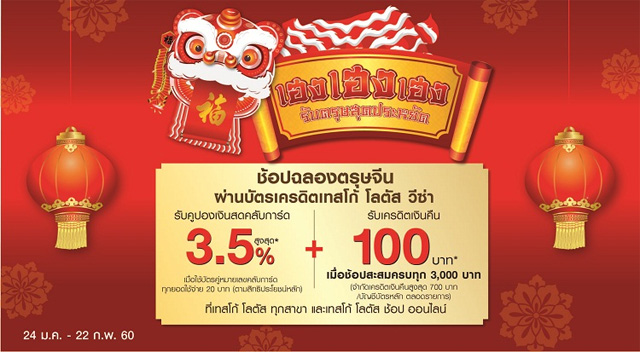 ช้อปฉลองตรุษจีน ผ่านบัตรเครดิตเทสโก้ โลตัส วีซ่า รับคูปองเงินสดคลับการ์ด สูงสุด 3.5% และรับเครดิตเงินคืน 100 บาท เมื่อช้อปสะสมครบทุก 3,000 บาท ที่เทสโก้ โลตัส ทุกสาขา และเทสโก้ โลตัส ช้อป ออนไลน์
