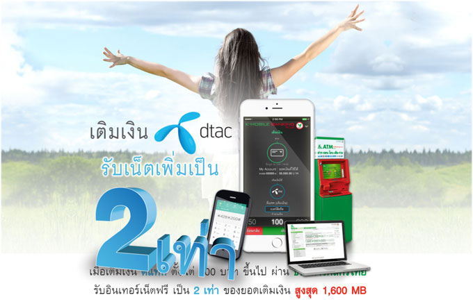 เมื่อเติมเงิน "ดีแทค" ตั้งแต่ 100 บาทขึ้นไป ผ่าน "ธนาคารกสิกรไทย" รับอินเทอร์เน็ตฟรี เป็น 2 เท่า ของยอดเติมเงินสูงสุด 1,600 MB