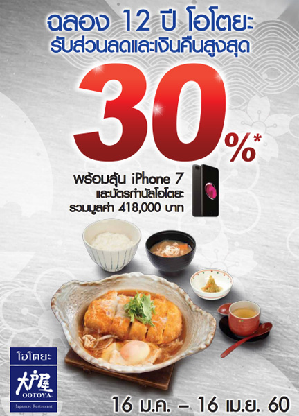 ฉลอง 12 ปี โอโตยะ รับส่วนลดและเงินคืนสูงสุด 30% พร้อมลุ้น iPhone 7 และบัตรกำนัลโอโตยะ รวมมูลค่า 418,000 บาท เมื่อชำระผ่าน