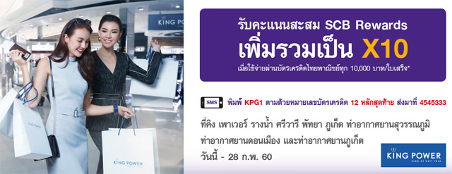 รับคะแนนสะสม SCB Rewards เพิ่มรวมเป็น X10 เมื่อใช้จ่ายผ่านบัตรฯ ไทยพาณิชย์ ที่ King Power