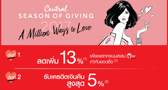 รับส่วนลดเพิ่ม 13% และรับเครดิตเงินคืนสูงสุด 5% เมื่อช้อปที่เซ็นทรัลทุกสาขาและเซน ผ่าน