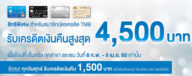 สิทธิพิเศษสำหรับสมาชิกบัตรเครดิต TMB รับเครดิตเงินคืนสูงสุด 4,500 บาท เมื่อช้อปที่เซ็นทรัล ทุกสาขา และเซน ตั้งแต่ 3,000 บาทขึ้นไป/ เซลล์สลิป