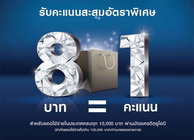 รับคะแนนสะสมอัตราพิเศษ 8 บาท = 1 คะแนน สำหรับยอดใช้จ่ายในประเทศ ผ่านบัตรเครดิตยูโอบี